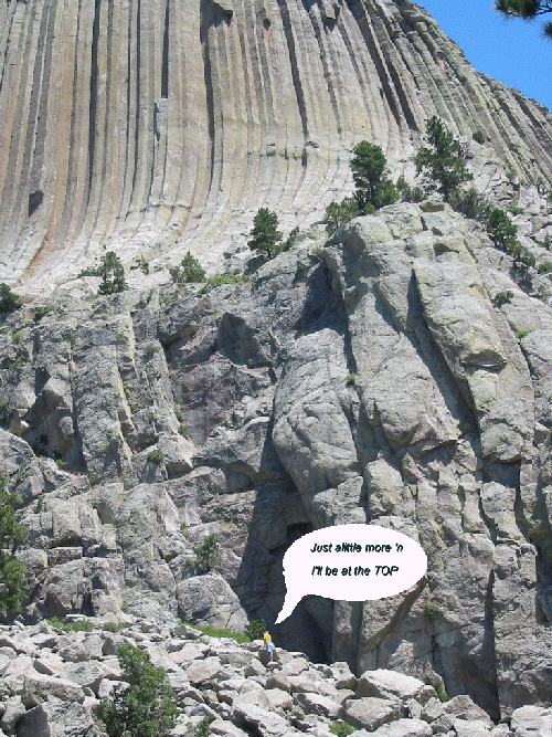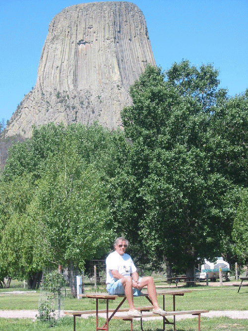 | Tues-7-01 | Walked trail at base of Devil's Tower. Met neighbor, who climbed to the top with renowned climber, Peter ? , great story! Went to local rodeo, sat on the rail. | ![]() ![]() |