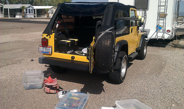 Taking Stock: 1st Mo. 1) Hot water tank leak. 5) Flat Tire of Jeep 2) RV Flat Tire - Van Horn 6) Repair Toilet 3) Phone into the swimming pool 4) Wind destroys the Top of the Jeep! |