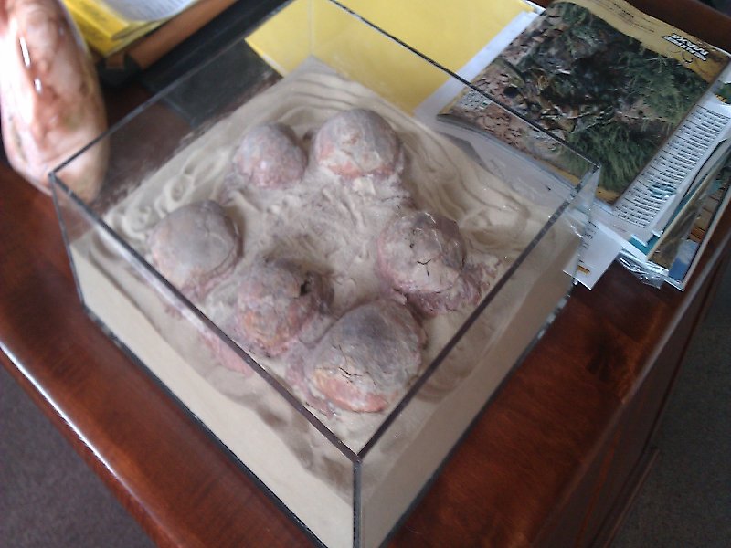 | 7-Jul | Went to talk to Progressive, not much they could do, gave me money for a new top, quote form Phoenix Jeep, except there are none in the US, as in none, Might have one in 3 Months. But the owner showed us around his office>>> Real Dinosaur Eggs! and lots of critters, |