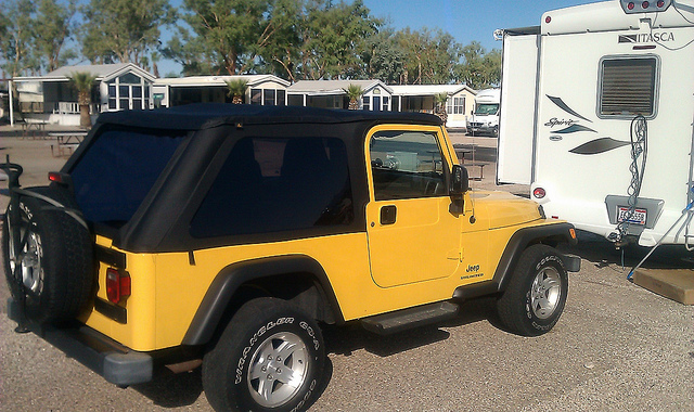| 14-Jul | So the top sits in Atlanta...., it's in Tucson, it's on the truck, it's HERE!..... Zip-zip, tug, pull, push, redrill holes in the right place, and presto, IT'S on the JEEP |
