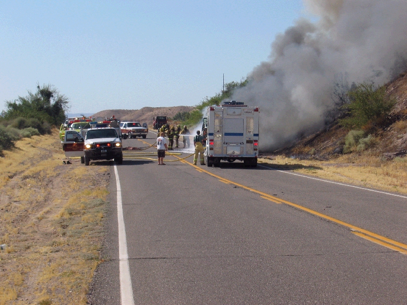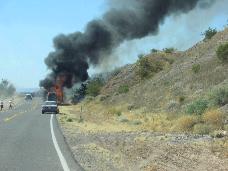 the lead wagon is set afire, 3 to be exact, exploding tires and gas tanks, but